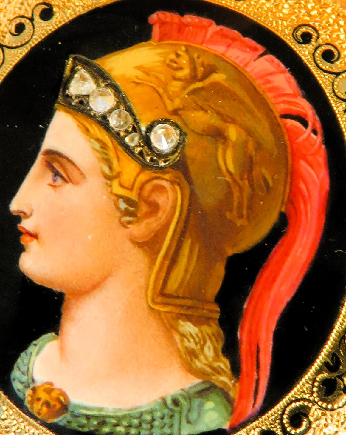 Massiv 18K Goldgehäuse mit wochenlang von Hand, oftmals mit Pinselchen mit nur einem einzigen Haar, in Lupenmalerei auf Emaille antikisierendem Porträt einer Dame, evtl. der griechischen Göttin Helena, von wirklich allerhöchster, fast einzigartiger Qualität, Detailausarbeitung und Feinheit der Darstellung