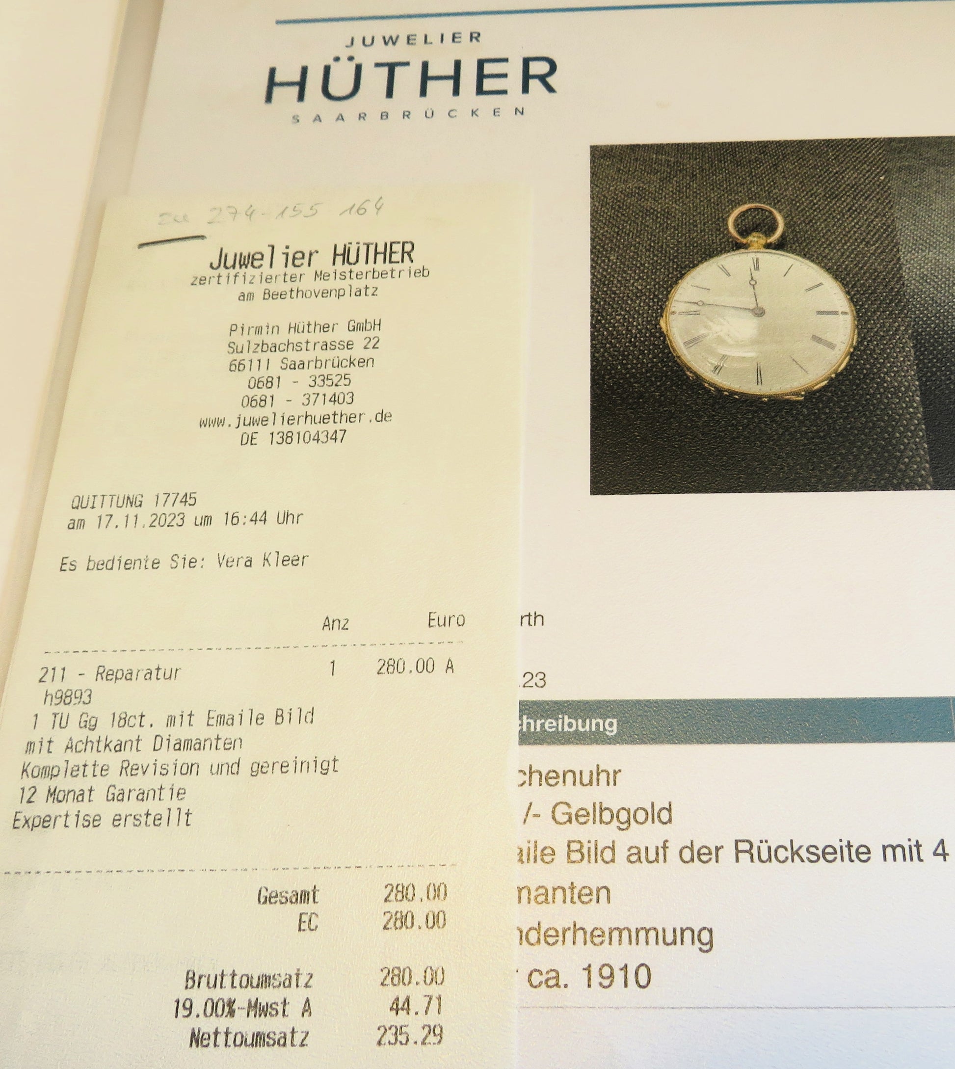 Alleine die Revision eines solche seltenen Stückes und mudealem Artefakt kostet mindestens Euro 750,- beim Uhrmachermeister, der 18K Bruchgoldwert beträgt - Stand Ende März 2026 - ca. 500,- Euro plus die Werte der 4 Diamanten